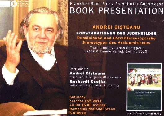 - Veranstaltung / Event: Discussion / Presentation: Konstruktionen des Judenbildes – Andrei Oisteanu, the autor of the book intitled „Konstruktionen des Judenbildes: Rumänische und ostmitteleuropäische Stereotypen des Antisemitismus”. Translated in German language by Larisa Schippel, Illustrated edition, Frank und Timme Verlag, Berlin 2010. The author of the book Andrei Oisteanu participates in this event. – Language of Event: German, English