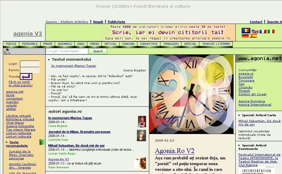 Zur Zeit läuft auf der rumänischen Site eine Diskussion über die Umgestaltungsmaßnahmen. In einer der Stellungnahmen kündet Radu Herinean, der Herausgeber, an, dass auch die anderssprachigen Varianten von agonia.ro/poezie.ro Änderungen erfahren werden. Also ist auch auf der deutschen Site mit Störungen in den nächsten Tagen zu rechnen.