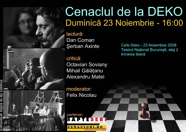 Vă invităm să profitați de această ocazie pentru a vă întâlni încă o dată cu Cenaclul de la Deko. Cenaclul va intra probabil într-o pauză de 2 săptămâni, în care Cafeneaua Deko se va muta într-o nouă locație.
