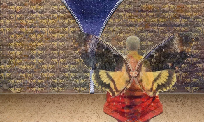 Devant un mur tapissé de papillons, tel Œdipe au pied de son Sphinx, ou plus simplement tel un moi-même au pied de ses murs, entre l’ombre et la lumière, je médite sagement sur « la Complexité » des briques du monde et sur leurs énigmes.